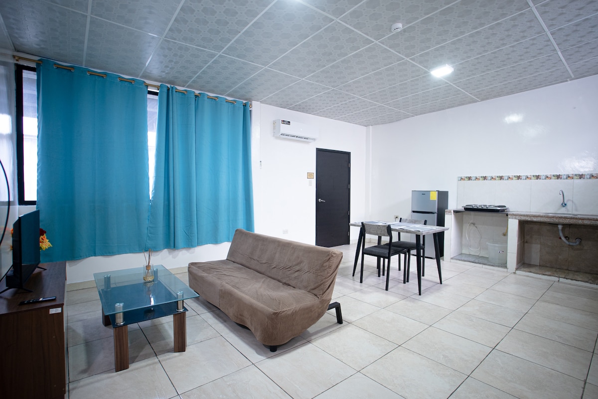 Enjoy the elegance and comfort of our suite in the exclusive area of Puerto Santa Ana, surrounded by excellent restaurants, cafes and outdoor spaces just a few steps away. In addition, you will have access to our social area with a pool, sauna, jacuzzi and gym, with impressive views of the Guayas River so you can relax and have fun during your stay.