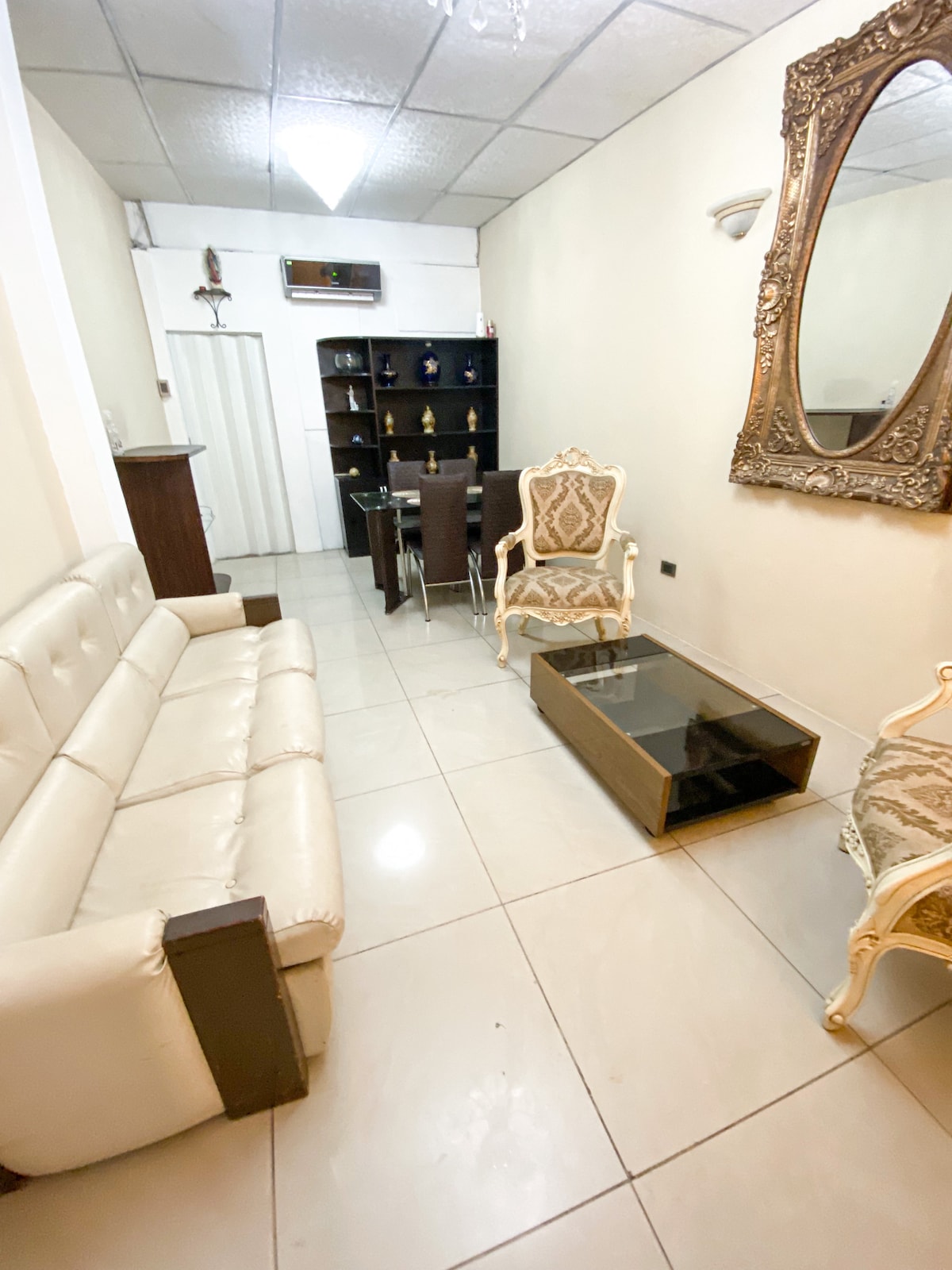 Suite de 2 ambientes, totalmente independiente, con 2 camas índividuales, aire acondicionado, 2 veladores con sus lamparas, una pequeña sala con su area de cocina, microondas, servicio de wifi y desayuno americano incluido en la tarifa. Sector residencial seguro, a pocos minutos de varios centros comerciales.