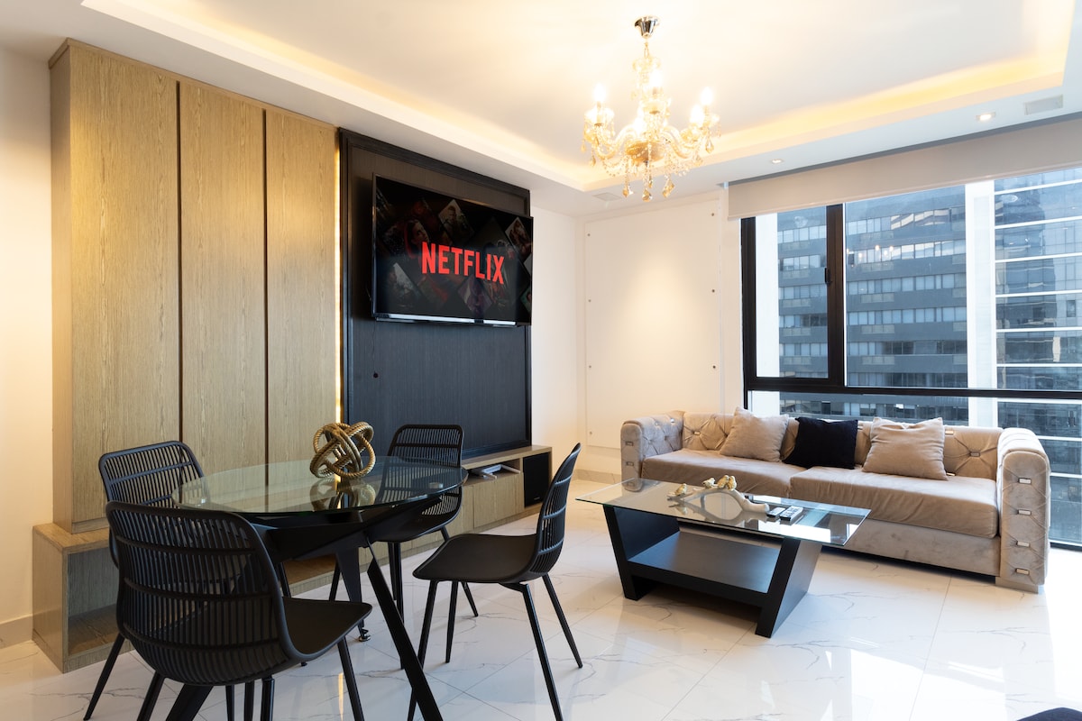 Fully furnished apartment with a spectacular view of the river. Our apartment is located in the most exclusive area of Guayaquil, on the banks of the River. Next to the Wyndham hotel, restaurant bars and much more. Super Fast Wifi, Netflix, TVs in all rooms, security and concierge 24/7.