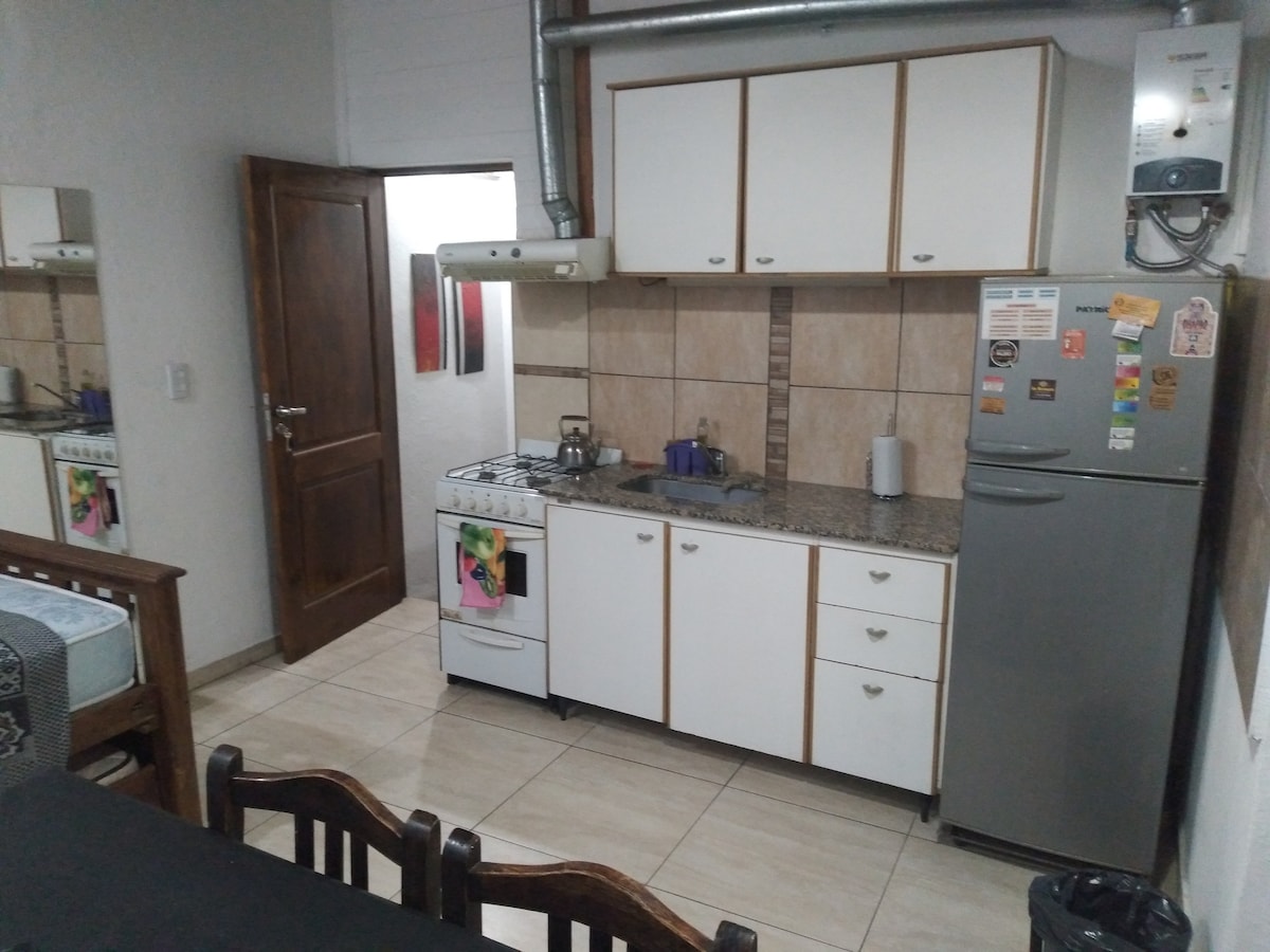 Disfrutá de un espacio nuevo y a estrenar. El departamento cuenta con una habitación con cama matrimonial, baño privado y cocina equipada. También dispone de aire acondicionado, TV y WiFi. Su ubicación es muy práctica: a solo 10 minutos del centro y 5 minutos de la terminal. El barrio es tranquilo y seguro, rodeado de negocios de todo tipo, con transporte público a una cuadra y bicisendas. Un lugar perfecto para parejas o viajeros que buscan comodidad buena y conexión con la ciudad.
