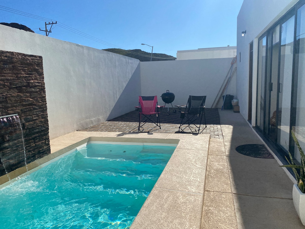 Casita "Shackleton" es completamente nueva y tiene ubicación céntrica pero tranquila. Tiene acceso libre a la playa a menos de 200 pasos, además de restaurantes, cafeterías, tiendas de conveniencia, super mercados y bares. No se requiere carro para disfrutar de los alrededores caminando. La casita es completamente nueva (2024) y lista para disfrutarse. Alberca lista para usarse.! por el momento la alberca no cuenta con caldera para temporada de frio