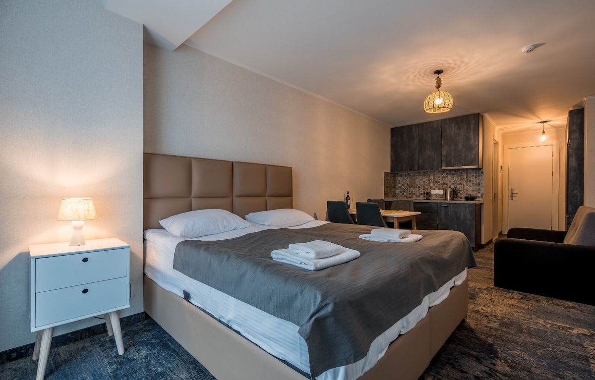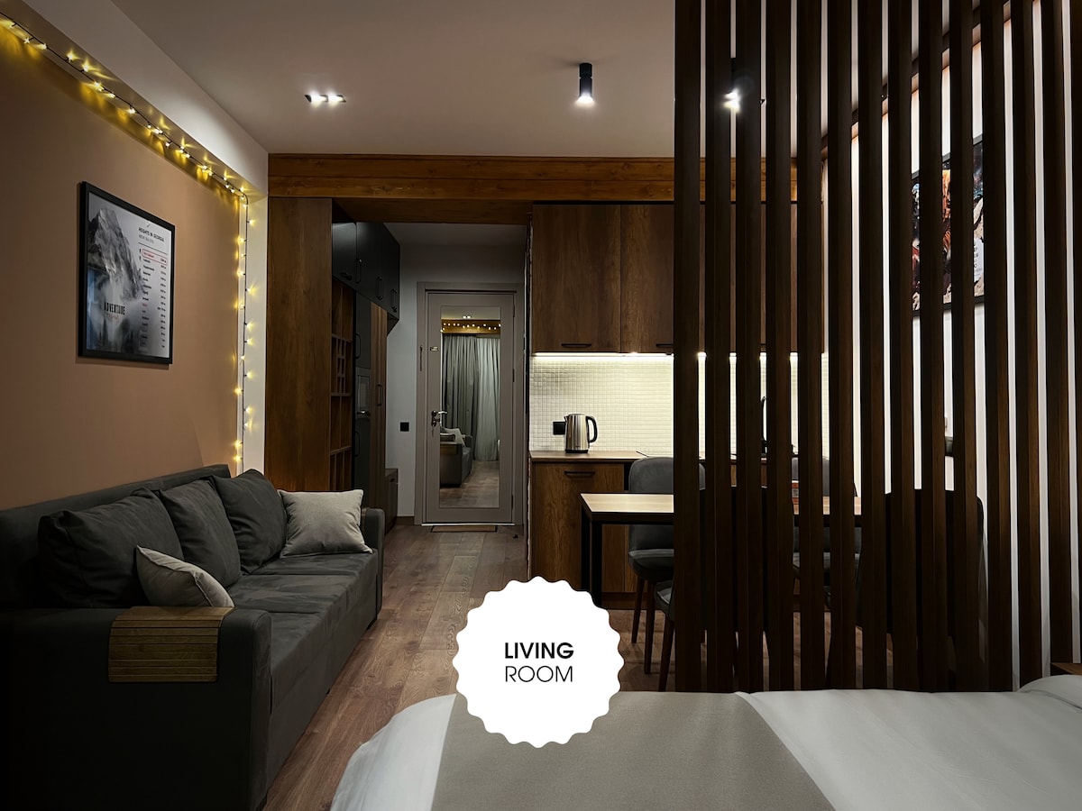 Welcome to the studio in Gudauri, Georgia, at an altitude of 2200 metres! Fresh renovation with wood and stone creates a cosy mountain atmosphere. Perfect lighting, functional areas - living room, bedroom, kitchen with panoramic windows giving natural light. The sunny side offers stunning mountain views. Close to the ski lift, shops and restaurants - ideal for a ski holiday. This studio combines style, comfort and functionality for an unforgettable holiday.