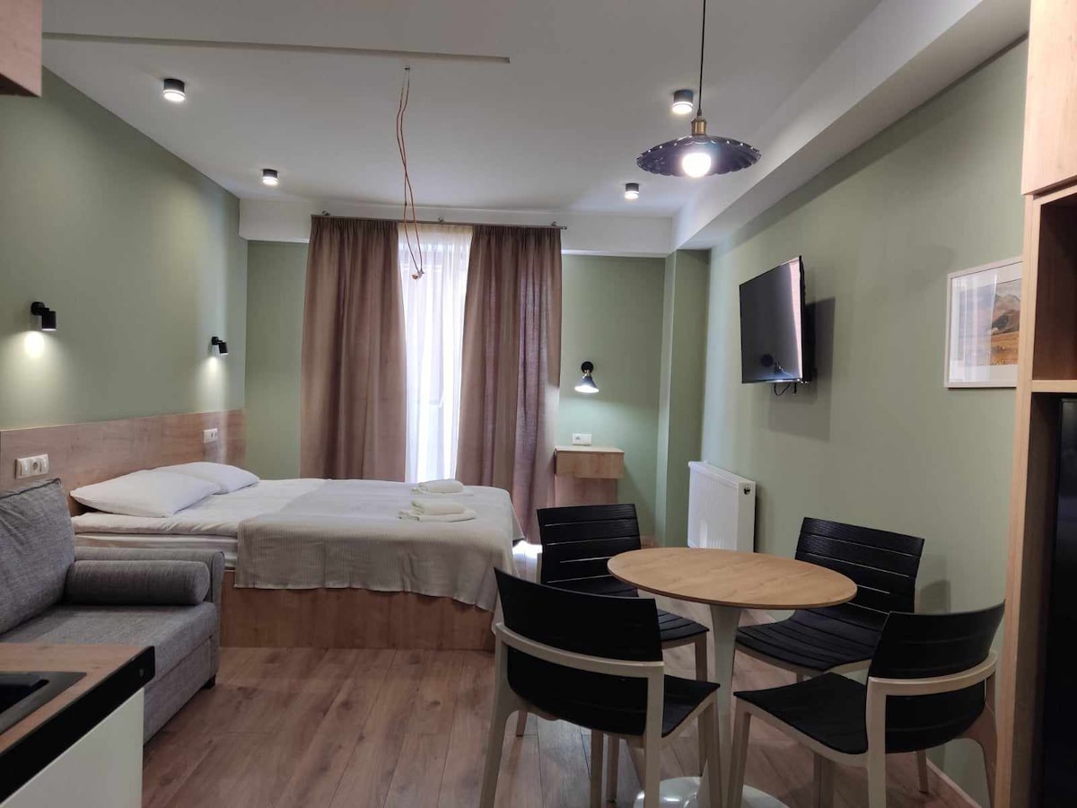 Welcome to this bright and cozy studio apartment, perfectly situated in New Gudauri. Quit location, free private parking and the same time very close to everything ( supermarket, pharmacy, cafes, bars and the best skiing courses ). The apartment offers a harmonious blend of modern comfort and a warm atmosphere. With a comfortable bed, a snug sofa, a well-equipped kitchen and a modern bathroom it has everything what you need to relax and recharge.