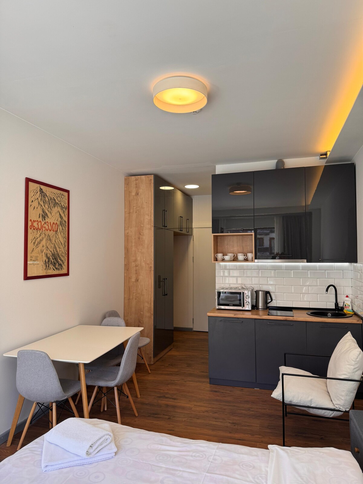 - Apartment is located in Gudauri few steps from ski area. -Apartment is cozy place, From the balcony you will see a beautiful view of mountains. -Apartment is perfect for small groups of friends, families and couples who love ski, mountains and beautiful nature! This modern studio features a kitchenette with all amenities , a flat-screen and a private bathroom with a shower. -Apartment has private Ski Depot -Appartment has one double bed and double sofa bed. -Self check-in ( Lockbox)
