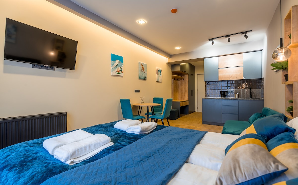 This beautiful Apartment is located in Heart of New Gudauri, walking distance from the main Ski lift, "Gondola"! A queen-sized bed with sleep-promoting mattress and comfy double-sized sofa , with a fully stocked kitchenette for home cooking, board games and amazing cozy atmosphere.