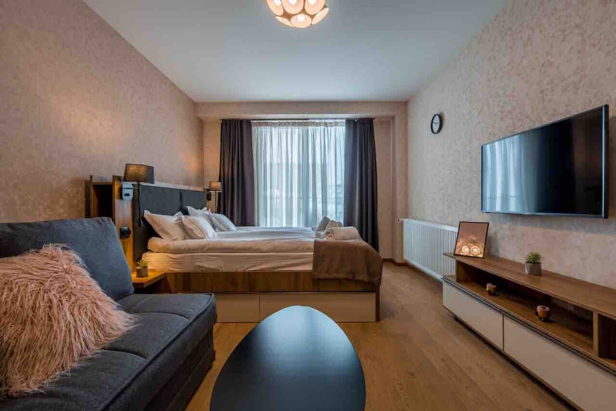 Welcome to our bright and cozy apartment in the heart of New Gudauri! Just steps away from the ski resort, gondola, and ice rink. Our stylish home features a balcony with stunning mountain views, a fully equipped kitchen, comfortable bedroom, two sofa beds, and a ski storage area. Experience comfort, style, and the magic of Gudauri all in one place!