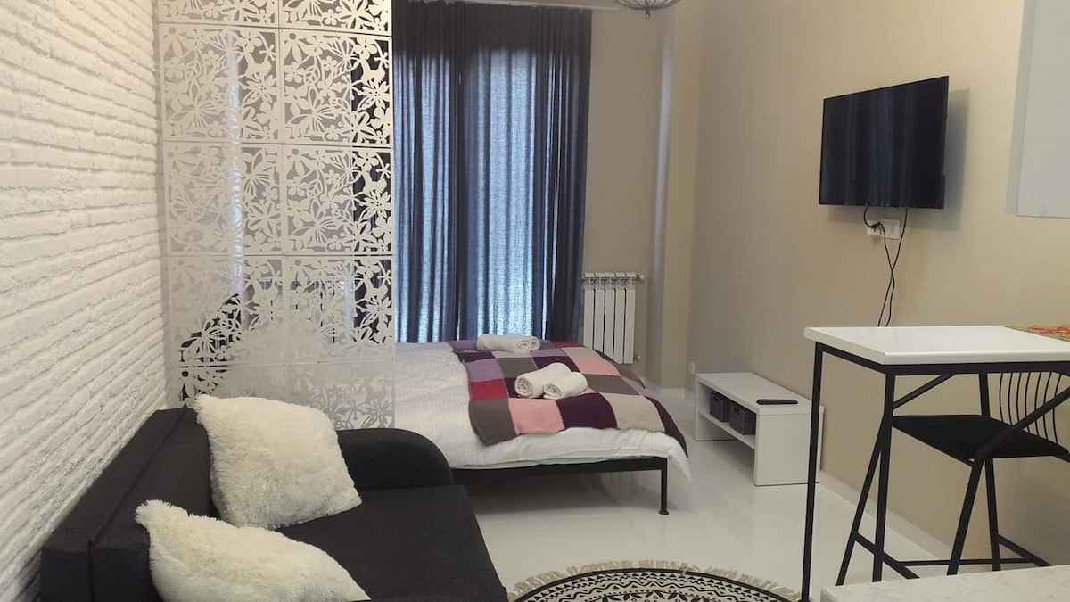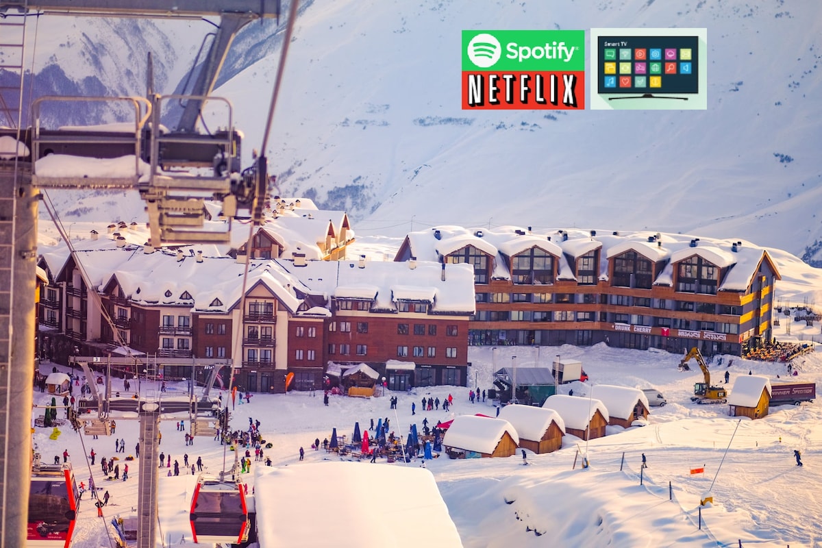 New Gudauri Newly renovated, all brand new warm hotel with Skiing mountain view on 3rd Floor. With private Ski Depot (Ski cabinet). 3-4 Minute walk to Gondola center main lift. * King bed or double twin bed option * Elevator * Free private Ski Depot (Ski Storage) * Free toiletries * Washing maschine * Hairdryer * Refrigerator * Fully equipped kitchen and a private bathroom. * Fee IPTV with 1000 premium worldwide channels * Free Streaming service Netflix * High speed independent internet wifi