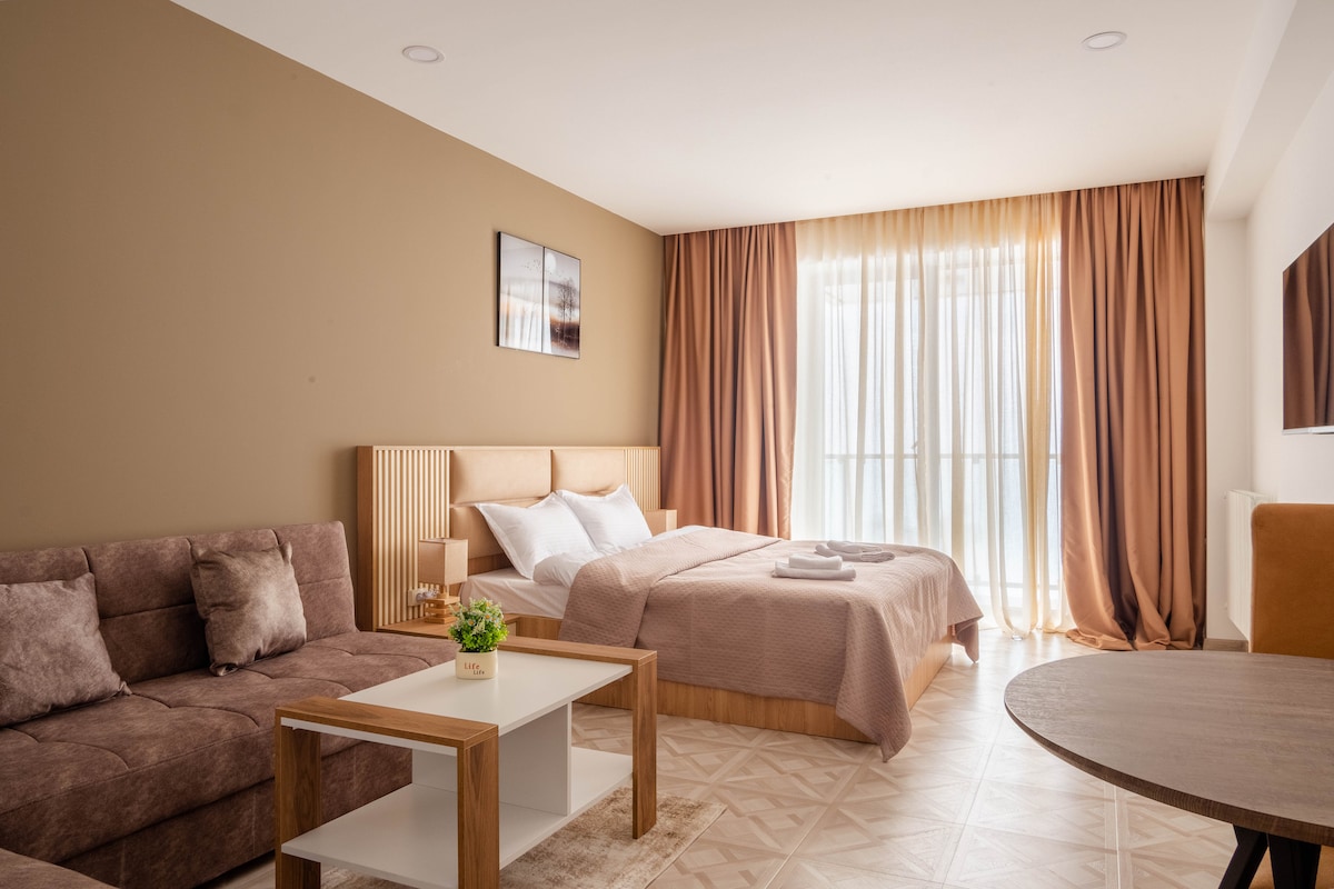 Well decorated and furnished Studio Hotel apartment with spectacular mountain view from both balcony and large king size bed, so you can enjoy the spectacular view from balcony or from the bed, it is located in the 2nd floor of loft 2 building of Redco Complex in Heart of New Gudauri, right next to Gondola Ski lift. The apartment has unique design, stunning mountain view from balcony. The apartment has super great location in the centre for those who like Skiing & other snow and mountain sports.