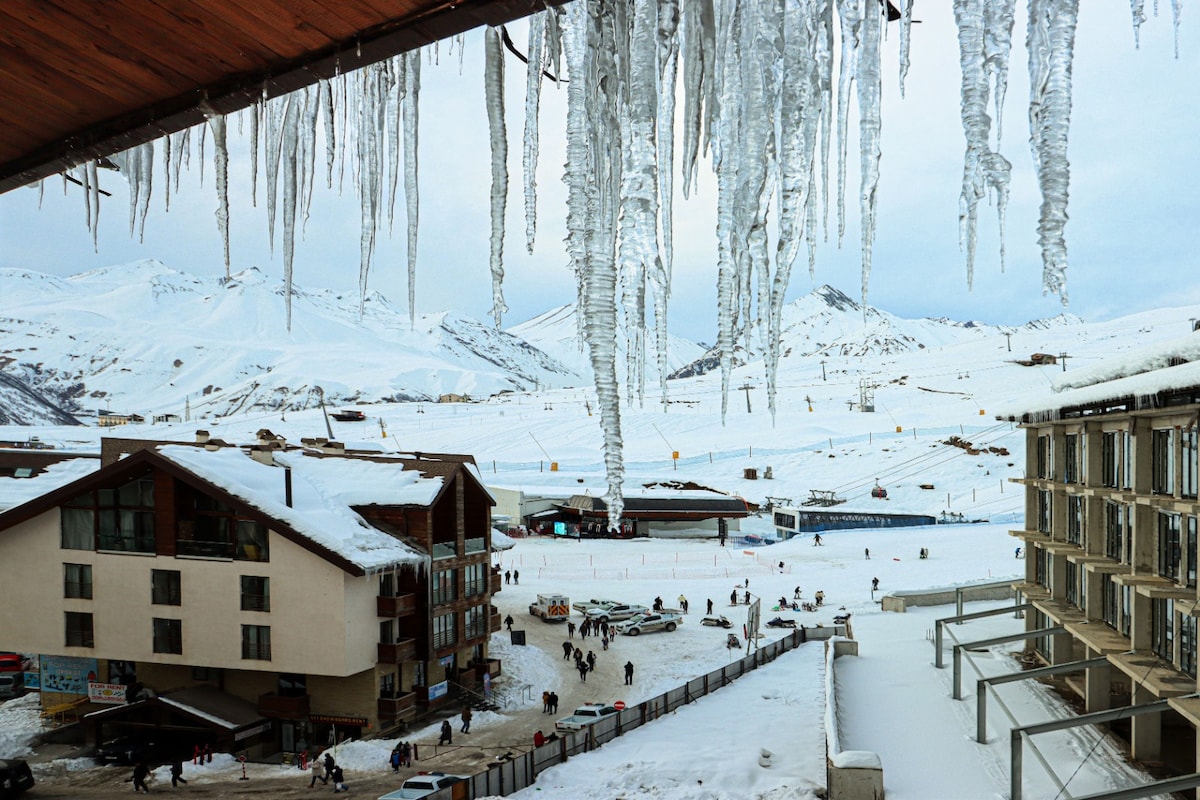 Relax from the tiring daily life in this apartment, which is not only relaxed but also stylish. Every detail is designed for your cozy vacation. Here is brief information: 👉 Mountain View; 👉 The apartment has a comfortable balcony with beautiful views; 👉 Accommodation for up to 3 people; 👉 30m to ski area; 👉 Self check in; 👉 Cleaning upon arrival; 👉 Free Ski Depot; 👉 Free WIFI; 👉 Transfer to Gudauri and back on request ( additional payment)