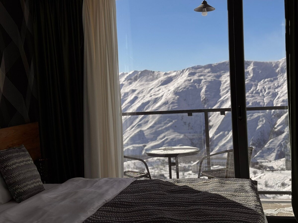 Well decorated and furnished Studio Hotel apartment with spectacular mountain view from both balcony and large king size bed, so you can enjoy the spectacular view from balcony or from the bed, it is located in the 2nd floor of loft 2 building of Redco Complex in Heart of New Gudauri, right next to Gondola Ski lift. The apartment has unique design, stunning mountain view from balcony. The apartment has super great location in the centre for those who like Skiing & other snow and mountain sports.