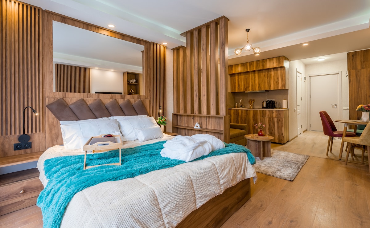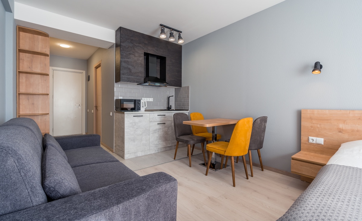 Dear guests, if you'd like to stay in a cozy luxury apartment with astonishing mountain views and a 1-minute walking distance to the ski loft, mini-market, and restaurants, this is the best place for you to stay. The apartment is fully equipped with everything you might need for your stay. Apartment features include a Wi-Fi, smart TV, queen-size bed, folding sofa, full kitchenette, bath with a hairdryer, and more. As a bonus, there is a ski rink right in front of the apartment. why wait? Book