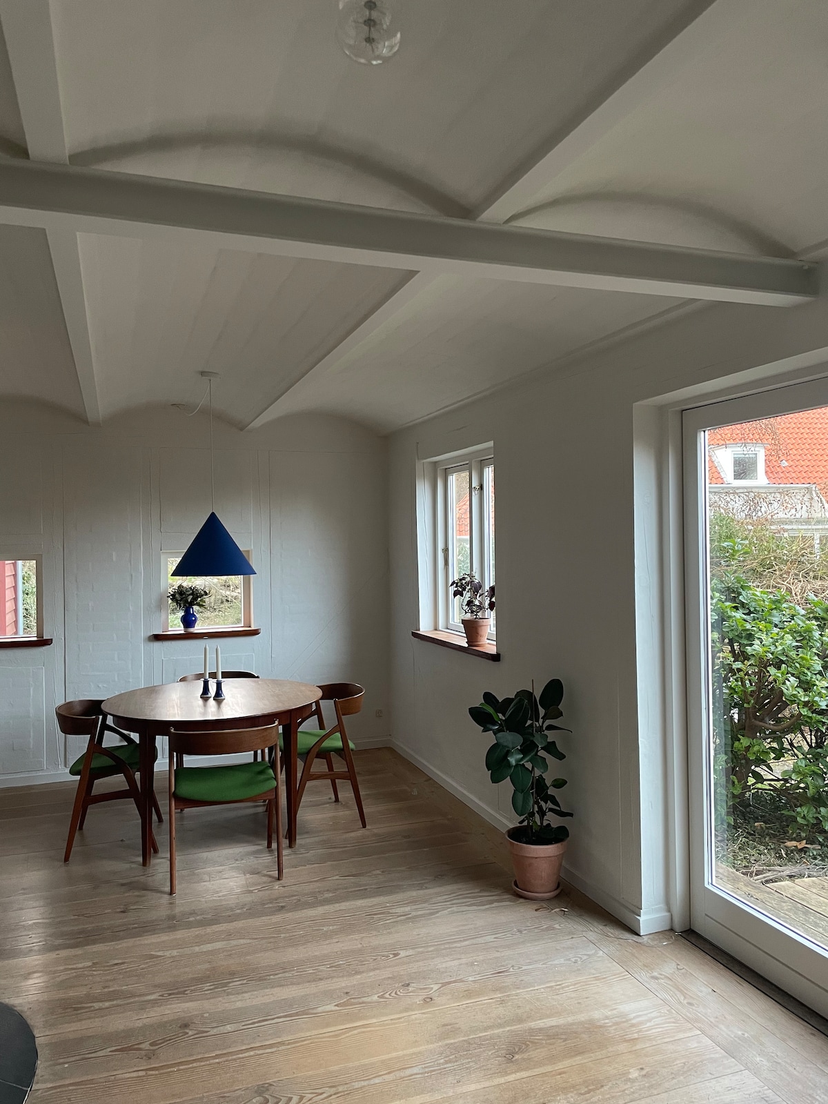 There are very few actual summerhouses in Gudhjem. Here is one - unique - both in style and location. The nordic/bohemian vibe is thoroughly implemented throughout the house. Everything from the bedroom with the pitoresque view upstairs to the kitchen/ livingroom area with the fireplace and the french door leading to the romantic small courtyard devided into tiny patios in different levels, to the lounge area with gasgrill amongst clematis on the surrounding stone fence, just screams hygge !