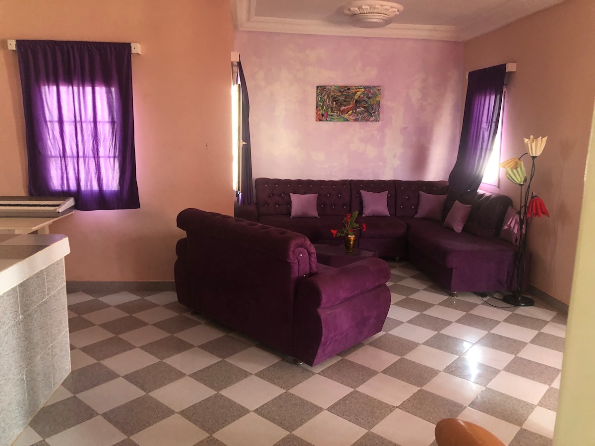 Bâtiment neuf situé sur une grande route principale bitumée à 300 m de la VDN et donc de la mer. Commodités, commerce et transport à proximité. 6 places de Parking réservées aux locataires. Cuisine équipée (four, gazinière, micro-onde, chauffe -eau, frigo, coin salle à manger... tout neuf). Wifi. Une grande chambre avec salle d'eau et balcon, toilettes publiques, salon, 2e chambre, grand espace familial (Possibilité d'ouvrir d'autres chambres). l'appartement se trouve au 3e étagede l'immeuble.