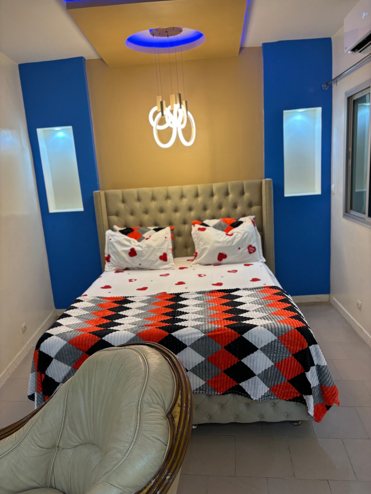 Bâtiment neuf situé sur une grande route principale bitumée à 300 m de la VDN et donc de la mer. Commodités, commerce et transport à proximité. 6 places de Parking réservées aux locataires. Cuisine équipée (four, gazinière, micro-onde, chauffe -eau, frigo, coin salle à manger... tout neuf). Wifi. Une grande chambre avec salle d'eau et balcon, toilettes publiques, salon, 2e chambre, grand espace familial (Possibilité d'ouvrir d'autres chambres). l'appartement se trouve au 3e étagede l'immeuble.