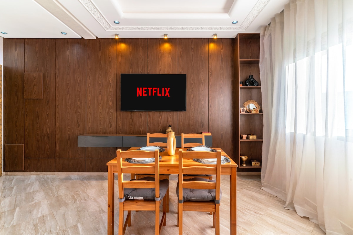 A wonderful unique apartment Located in centre city gueliz Beautiful view of the theatre Royal And Atlas mountains equipped with wifi fiber optic high speed 100 mega , netflix movie Equipped smart lock door , closing and opening door automatic Near of Many restaurants and bars train station 300 metre Bus station 90 metre jemaa el fna 10 min Carre eden mall 500 metre Kfc and Macdonald ... 500 metre carrefour market 400 metre Parc el harti 250 metre