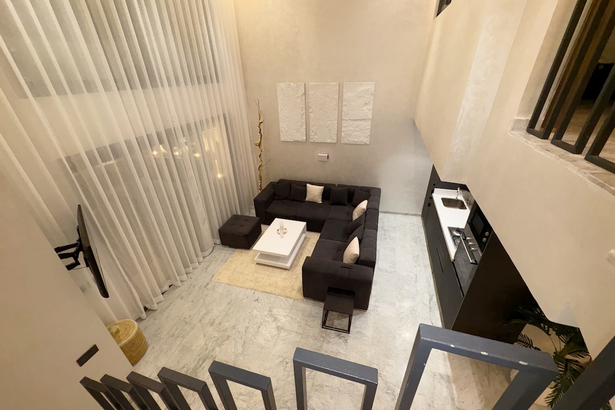 🏡 Stay in this modern chic loft with private terrace in Marrakech! 🌞 Bright and spacious, it features a zen terrace with wall fountain and motorized pergola for a unique moment of relaxation. 🛋️ Cozy upstairs bedroom with private bathroom and WC. New, high-end, and secure building. 🍽️ Cafés, restaurants, and shops nearby, Medina and Jemaa el-Fna just 5 min by car. Enjoy a comfortable and unforgettable stay! ✨