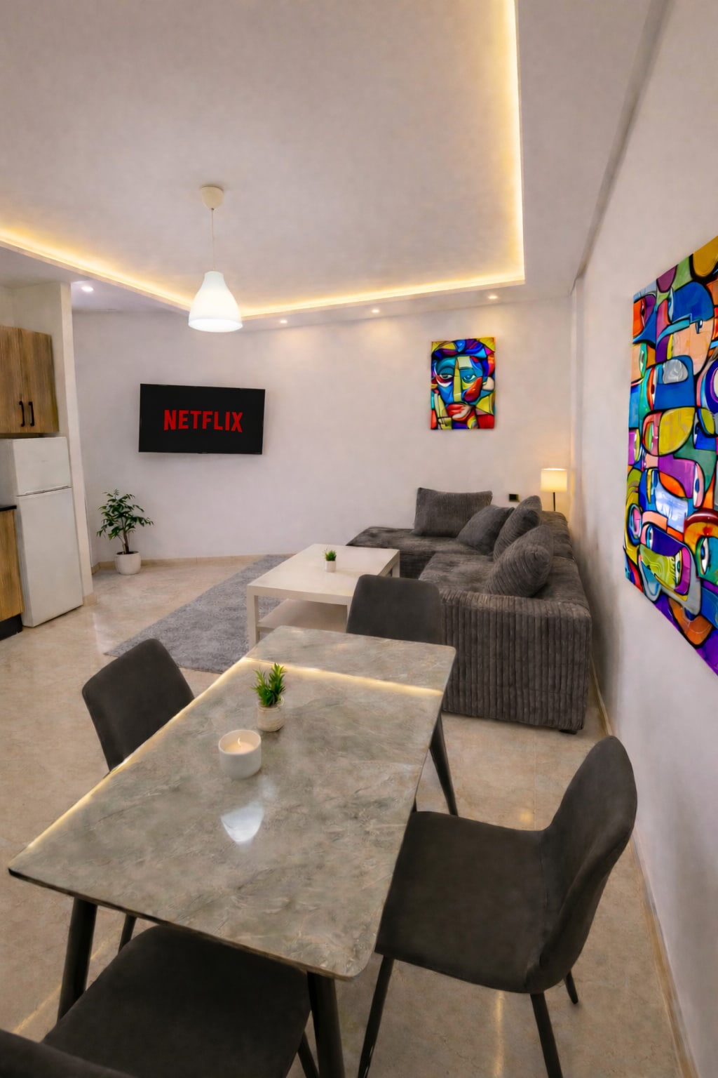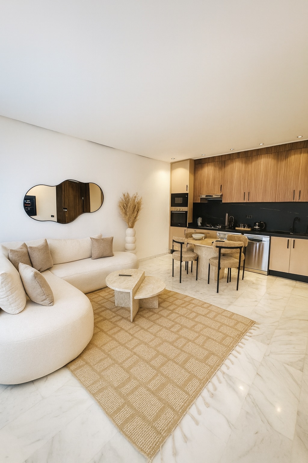 Welcome to our thoughtfully designed one-bedroom apartment with pool, where positive energy flows through every inch. in the center of Gueliz 10 min walk from carré Eden and the 5 minutes from the train station. Perfectly situated, you'll be surrounded by an array of restaurants, cafes, and shops. Well Equipped, we've taken care of every detail, high-speed internet, IP TV, Netflix, ensuring a seamless experience and make your stay stress-free