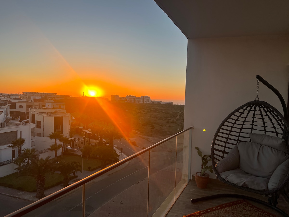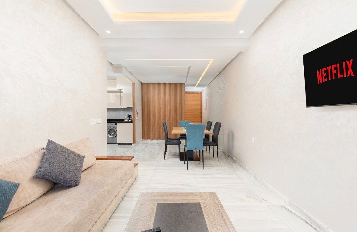 Offrez-vous un séjour reposant dans ce bel appartement climatisé, idéalement situé dans un quartier calme et sécurisé, à moins de 10 minutes de la plage. Vous serez à proximité immédiate des commerces : Marjane et Carrefour, de nombreux restaurants, salles de sport, spa et hammam également disponibles à quelques minute.Situé au 4ᵉ étage avec ascenseur, l’appartement offre une vue dégagée et un grand confort. Profitez d’un espace moderne avec tout le nécessaire pour un séjour agréable wifi fibre