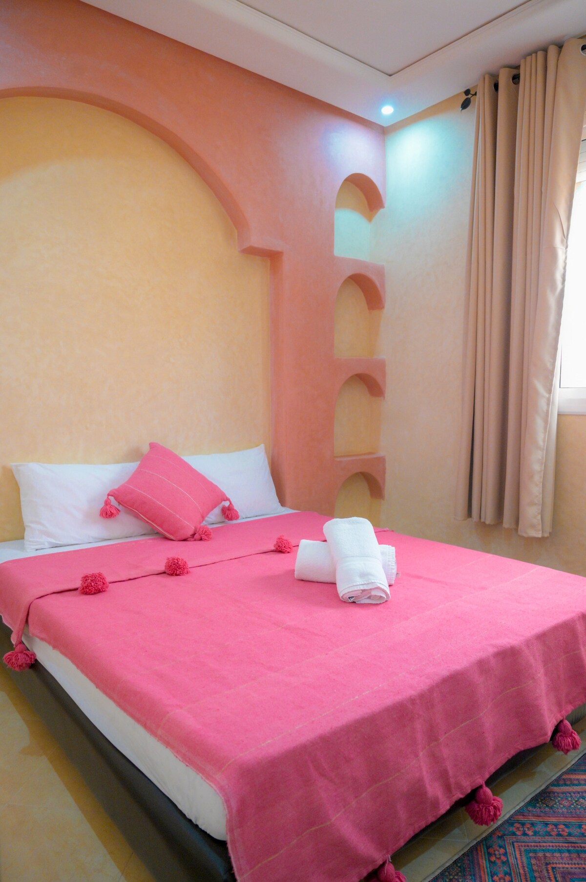 Appartement, dans le meilleur quartier d'Agadir, à quelques pas de la plage et à quelques pas du centre commercial. Il y a des cafés / restaurants incroyables et propres à deux pas de l'appartement. La Résidence est à proximité de la plage à pied 10 min .l'aéroport est à 30min en voiture. Vous êtes sécurisé 24h/24 et accédez à 2 piscines, appartement en 2éme étage ,immeuble avec ascenseur .