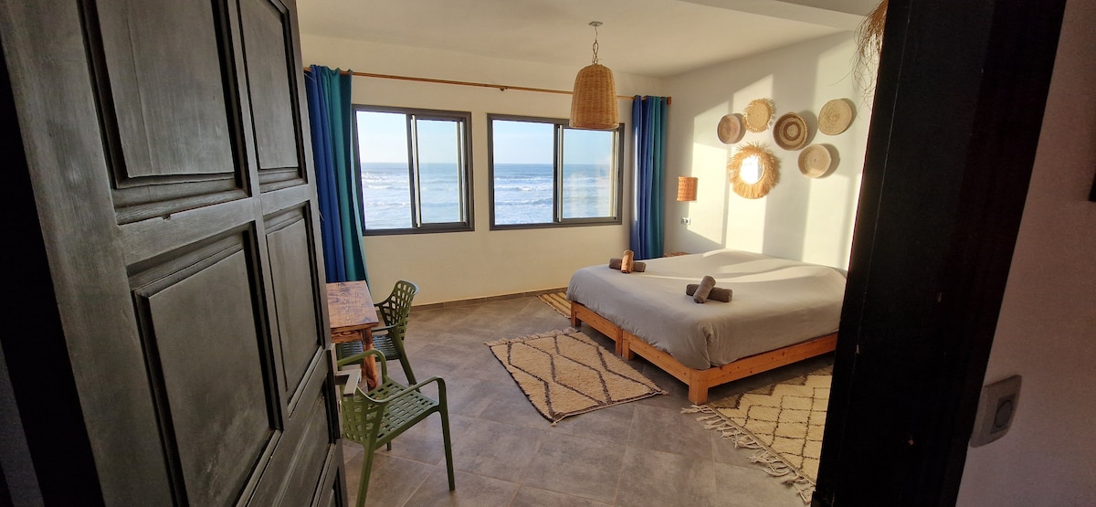 Vivez une expérience unique dans cet open space chic et bohème, situé directement sur la plage de Legzira. Deux lits confortables, un salon cosy, une table à manger élégante, salle de bain effet marbre… le tout baigné de lumière naturelle avec une vue imprenable sur l’océan. Chaque détail, du décor aux matériaux, crée une atmosphère chaleureuse et raffinée. Le son des vagues, les couchers de soleil et l’accès direct au sable font de ce lieu un havre rare et inoubliable