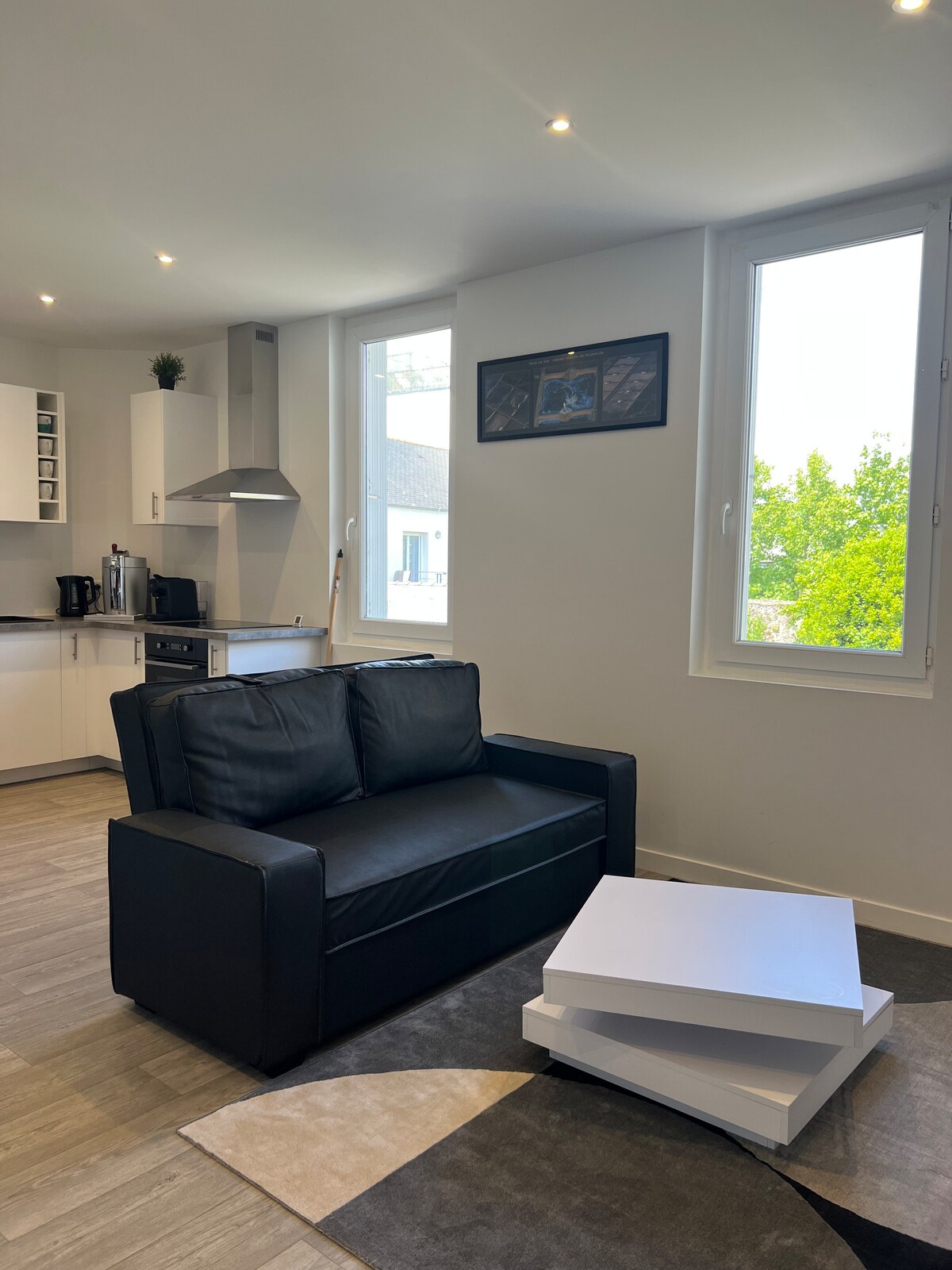 Joli appartement de 30 M2 face à la collégiale de Guérande, au ❤️ des remparts Logement situé au 3ème étage (sans ascenseur) d'un des plus vieux bâtiments des remparts: " Le Vieux logis". Entrée privative sur escaliers, cuisine ouverte (réfrigérateur, lave vaisselle, four, micro ondes, plaques vitrocéramique, cafetière à filtre et cafetière Tassimo) sur salon. SdB avec baignoire et WC. 1 chambre avec lit 160x200, Literie Emma Matelas et penderie. Lit parapluie ou chauffeuse à dispositi
