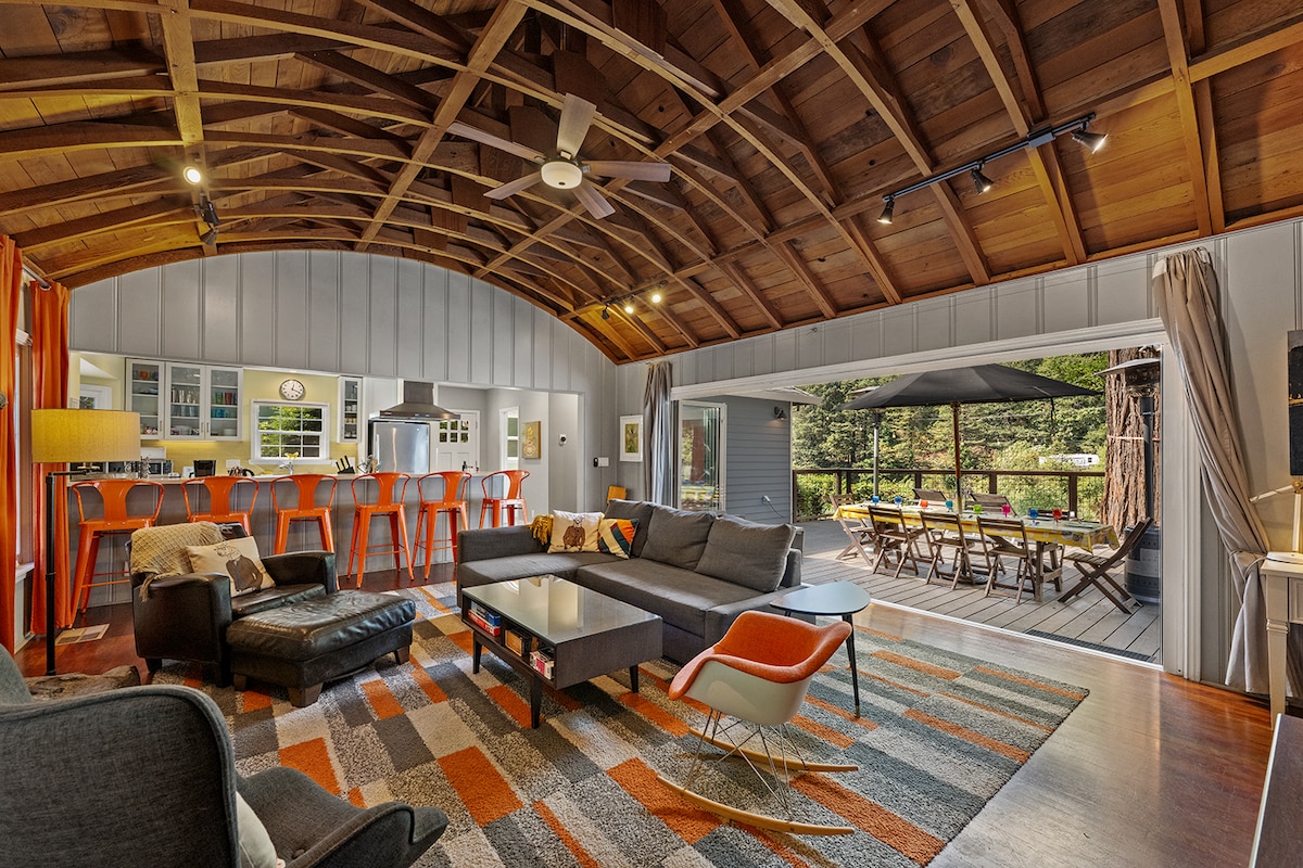This bold, eclectic 2000 sqft cabin provides a unique bohemian experience and a spacious calm retreat, ideal for multiple couples or families. The Black Sheep is nestled among the redwoods and perfectly situated for the Russian River (4min), wine tasting (8min), restaurants (10min), and the Armstrong Redwoods preserve. After a day spent floating on the river or tasting some of the best wines in the world, soak in the hot tub, BBQ, or watch a movie/karaoke/play games on the 12ft movie screen!