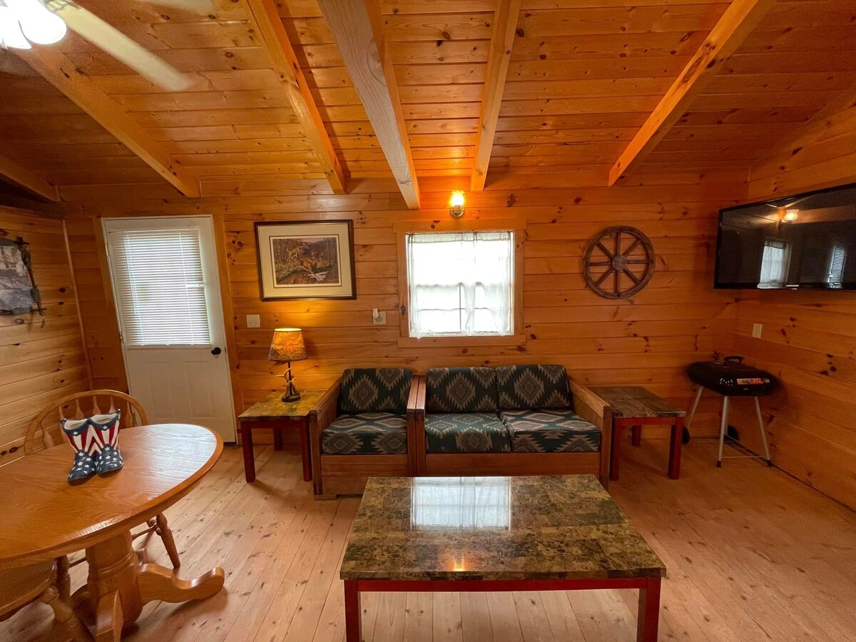 Relax with the whole family at Seneca Lake in this peaceful lakeside cabin with open floor plan. Two bedrooms: Queen and twin bunks plus single twin with one bathroom. Enjoy an updated kitchen with plenty of counter space. Patio area offers outdoor seating/dining, gas grill, and umbrella for afternoon shade. Fire pit in backyard for s'mores around the campfire. Lake access available at Seneca Lake Park and public launch area.