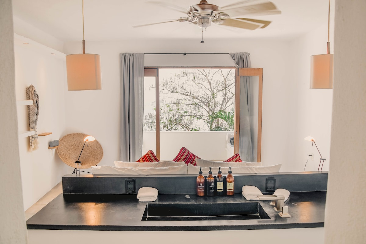 Casa Manzanillo is a gorgeous Boutique Hotel located at on the Beach at Manzanillo Bay in the quiet fishing village of Troncones, Guerrero; MX. Manzanillo Bay is considered on of the most beautiful beaches on the Pacific Coast of Mexico. Situated on the Northern End of the Bay, our property sits directly on a pristine beach. If you are looking for crowds...you won't find them here! The Bridge Room has a King Bed, Air Conditioning, private Bathroom. The Bridge Suite has a spacious balcony, wh