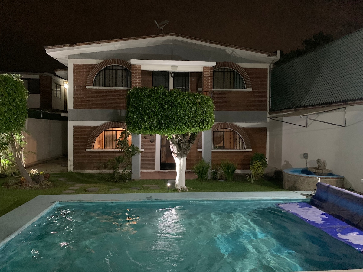 Hermosa casa sola para descansar y convivir en familia disfrutando el mejor clima de Morelos. A la entrada del pueblo de San Gaspar. Todos los servicios y a minutos de los principales salones de eventos sociales y club de golf Hacienda San Gaspar. 4 habitaciones , sala, comedor, cocina equipada y 2 baños completos dentro de la casa. Alberca climatizada (opcional), asador y baño completo para uso exterior. Estacionamiento 2 autos. WI-FI, Tv Cable. Hasta 10 personas. Fin de semana/ semana completa
