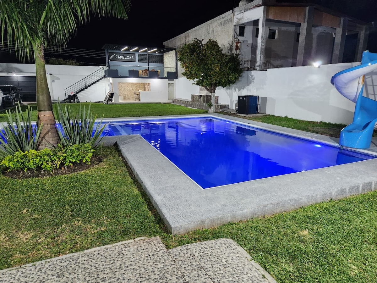 Bienvenidos a nuestro oasis de descanso con alberca! Nos complace ofrecerte un refugio sereno donde puedas relajarte, desconectar y crear recuerdos inolvidables. Desde la refrescante alberca donde podrás sumergirte y revitalizarte bajo el sol, hasta los rincones acogedores donde podrás compartir momentos especiales. Esperamos que te sientas como en casa y que disfrutes al máximo de todo lo que nuestro hogar y sus alrededores tienen para ofrecer. ¡Bienvenidos a tu escapada perfecta!"