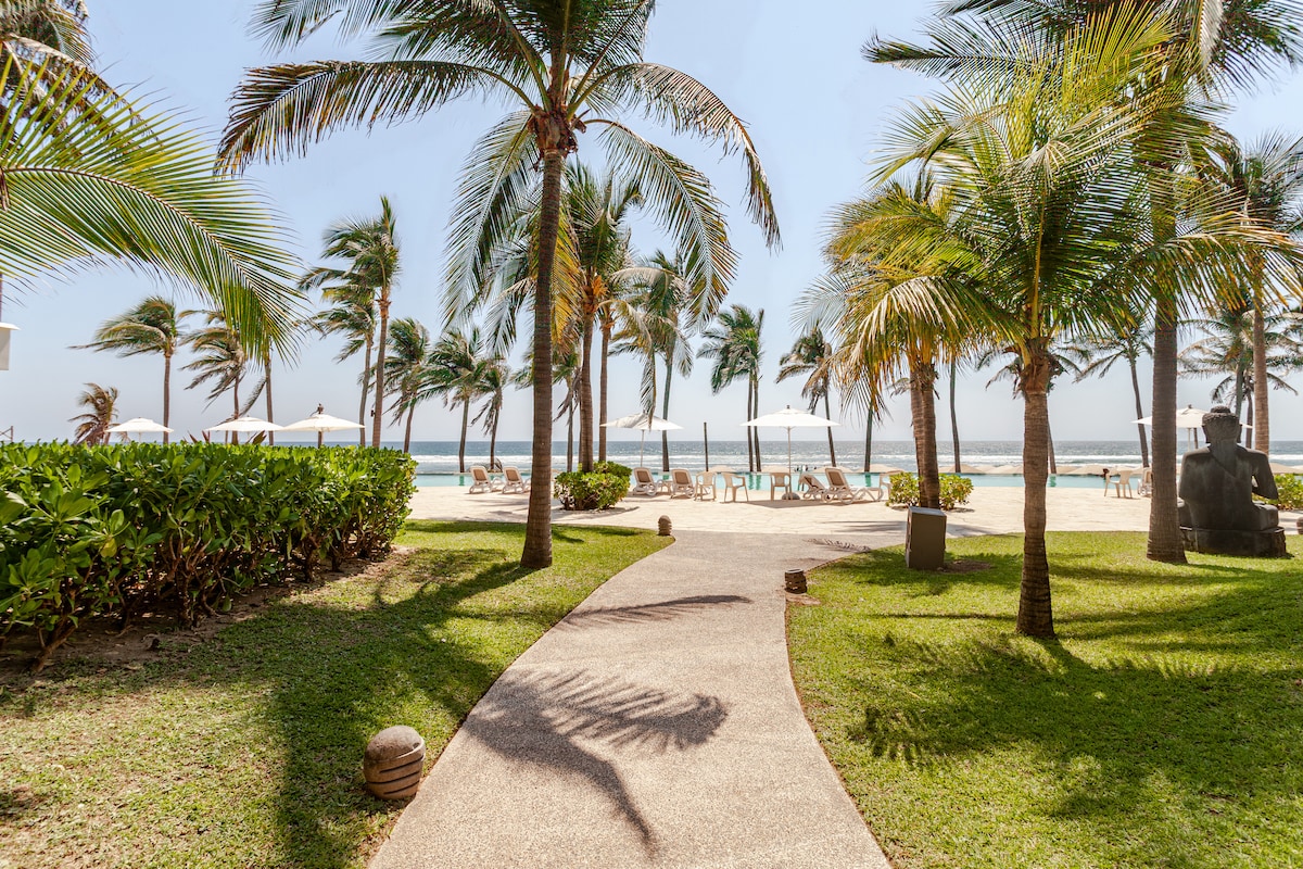 A lovely, beachfront get away from where one can comfortably relax, eat and sleep, when not enjoying the gorgeous beach and pool and all that Ixtapa has to offer. The Condo is located on the 6th floor and has a spectacular wall to wall picture window in the living room that slides open to fantastic mountain, golf course and sunrise views. Patio sliding doors lead to fabulous ocean and mountain views with amazing sunsets over the Pacific Ocean.