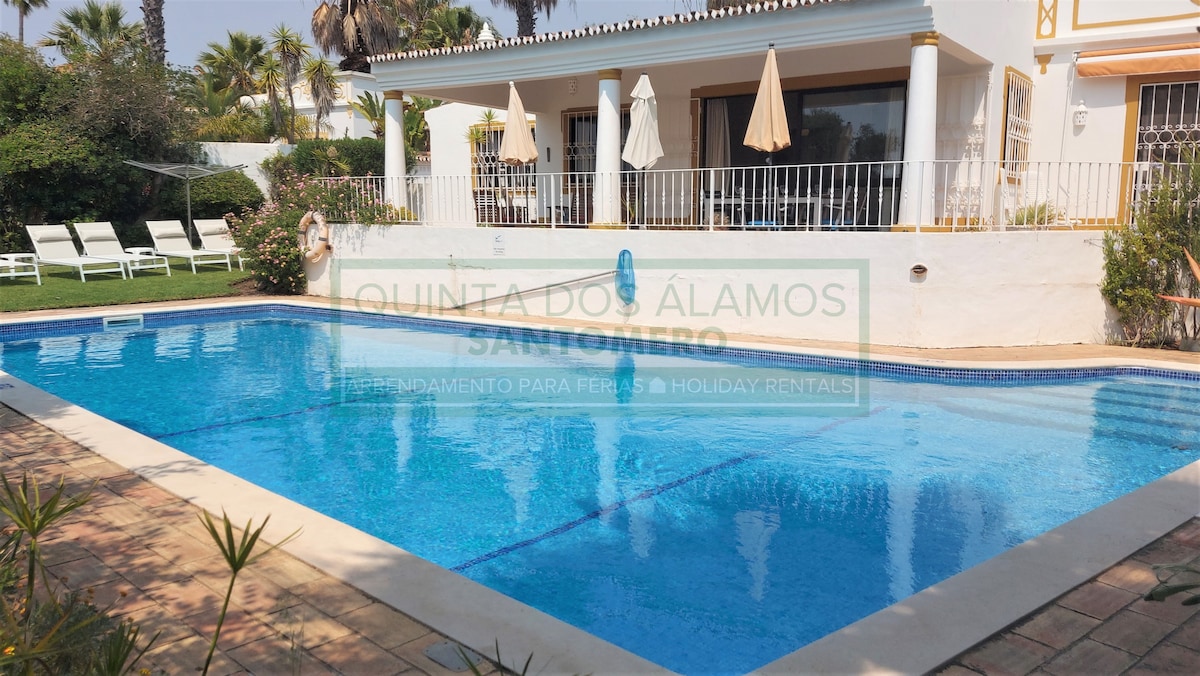 Holiday house for 6 people with 3 bedrooms, swimming pool, small garden and barbecue area, located in Quarteira, just 10 min. walking from the beach. Restaurants, supermarkets, cafés nearby. Cleaning with produts composed of agents with active infredients with virucidal action.