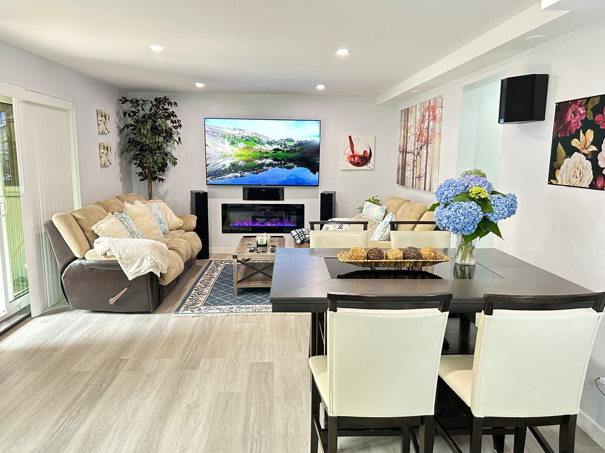 Unwind in this newly built & luxurious home equipped with premium appliances & high-end furniture. This 7 bedroom, 5.5 bath home boasts high ceilings, central AC/heating, motorized blinds, and over 3600 sq ft. of space. Relax on the massage chair by the cozy fireplace or enjoy steam showers with peace of mind while your kids enjoy our gated playpen. Set the mood outdoors with our private patio equipped with a BBQ, outdoor umbrella/seating area, and string lights.