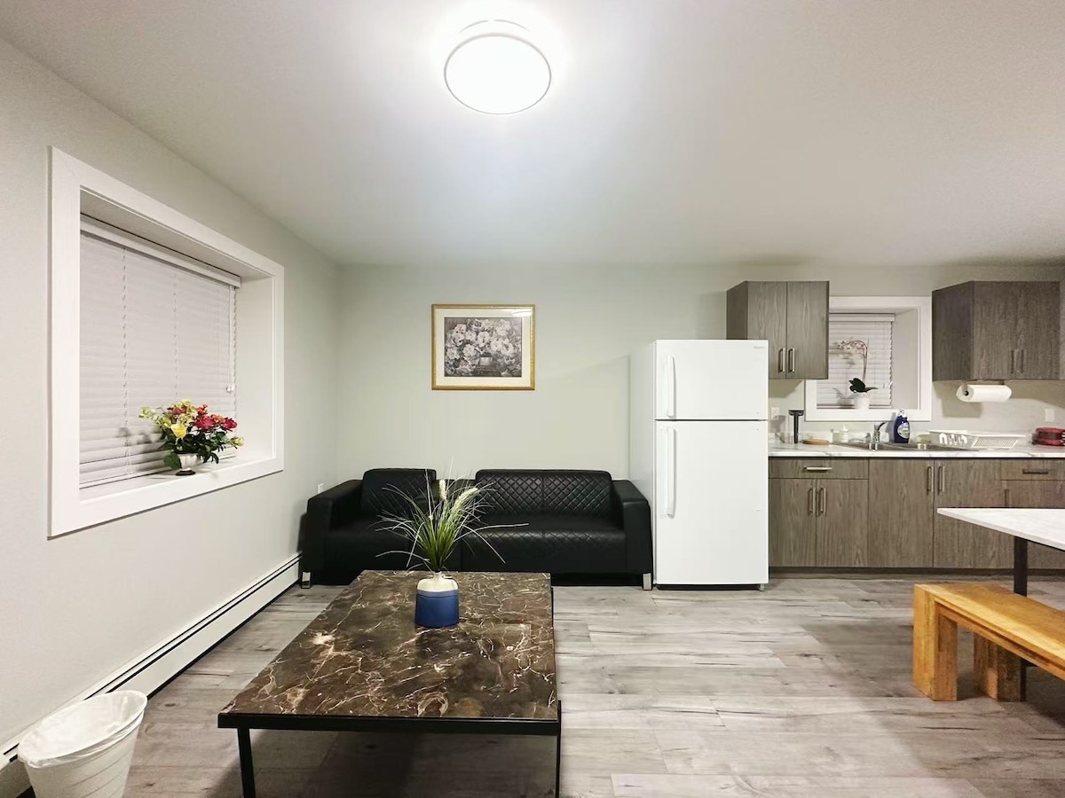Brand-new custom suite. 1 Bedroom with 1 Queen bed (Sleeps 2 guests) + Living Room (Sleeps 2 guests on two foam mattresses) + Office Desk + attached bathroom/shower. The suite has its own living room with Shaw Cable TV. Couch + electric recliner. Parking included on driveway at front door. The suite has a microwave and fridge in a small no cooking partial kitchenette. Full size desk + chair.