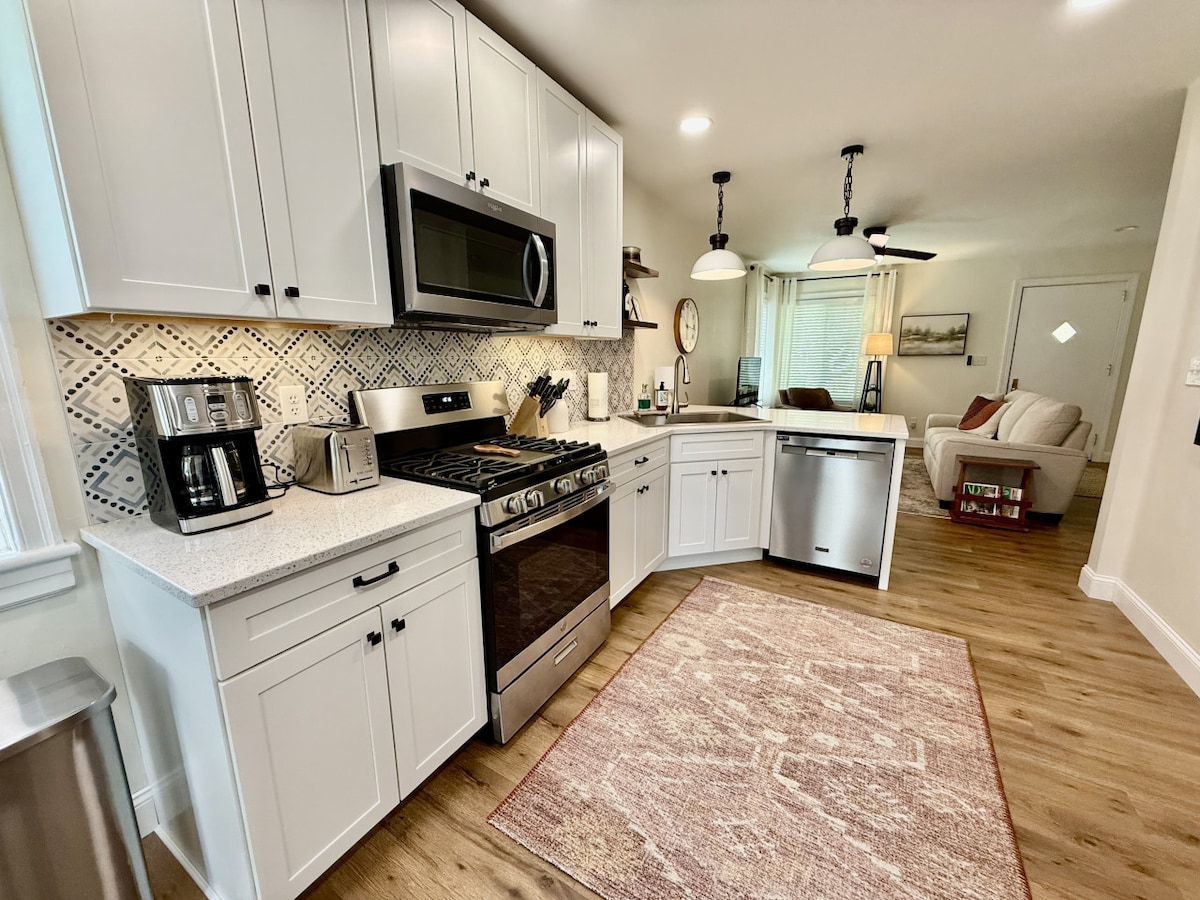 "Eagles Landing" is a stylish experience that is a centrally-located, brand new house, perfect for anyone visiting the Triad. Professionally decorated with new furniture, appliances, linens and a well stocked kitchen. Walking distance to Furniture Market, the Hospital, Caroline Core Stadium & multiple dining options. Less than 2 miles to High Point University. Relax in the living area with the 65" TV, or hang out on the front porch or enjoy the privacy of the fenced in backyard.