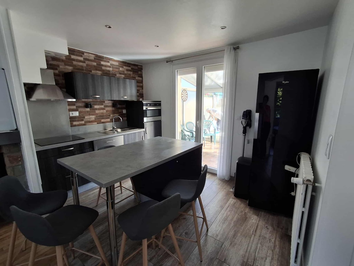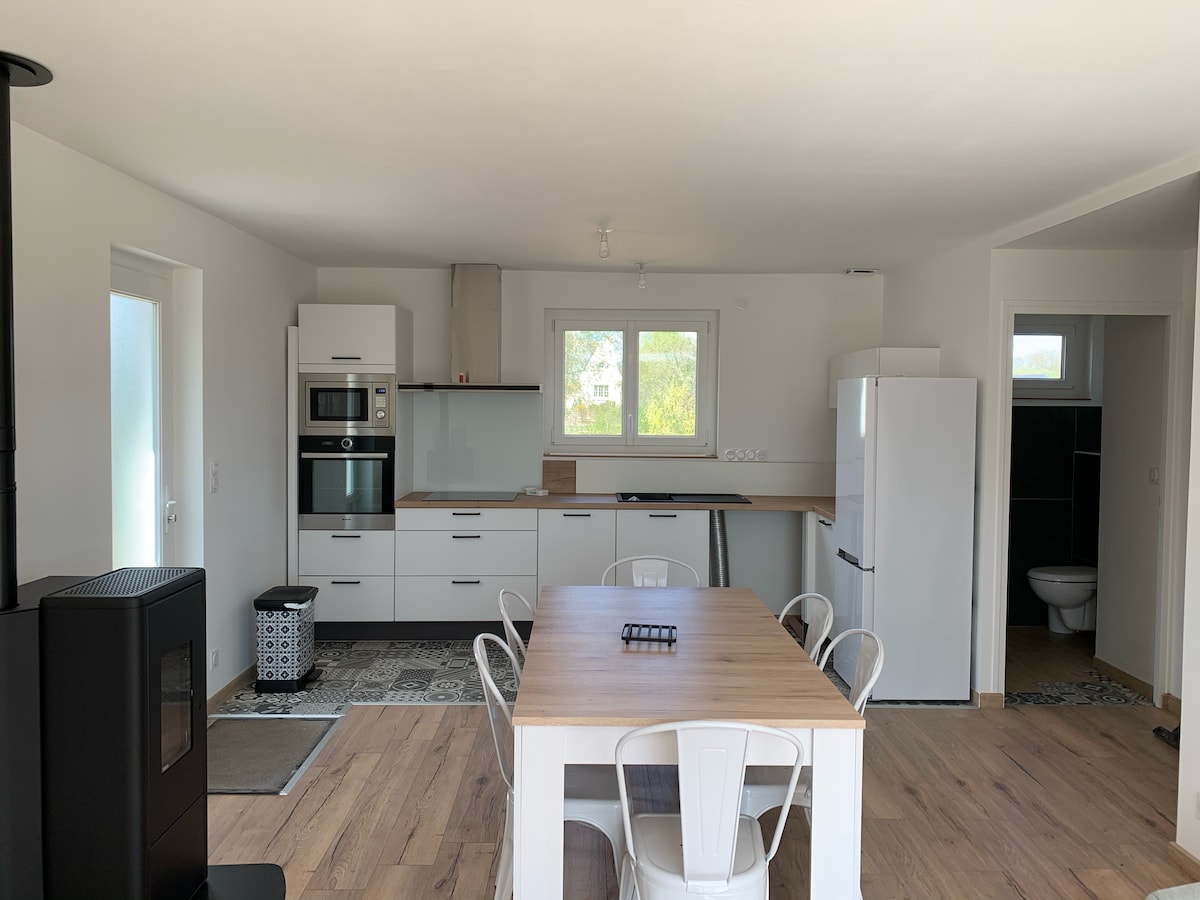 Envie d'un lieu spacieux proche de Guingamp ? Cette maison rénovée de 110m² vous ouvre ses portes. À deux pas de la gare, dans un quartier paisible, chaque espace est pensé pour votre détente. Le salon, avec poêle à granulés et TV 4K connectée à Netflix, est cosy. La cuisine, super équipée. Trois chambres douillettes avec lits neufs et TV promettent des nuits douces. Et les deux salles de bains élégantes avec douches à l'italienne assurent votre relaxation. De plus le stationnement est