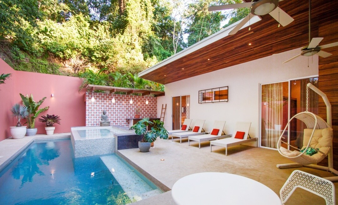 Part of Nalu Nosara, a boutique luxury retreat of five private villas—each with its own saltwater pool, secure parking, playground/ninja course, and full-time guard. Enjoy 50% off ($10/class) yoga, fitness, & martial arts at our on-site studio. Nestled on a quiet street in the heart of Guiones, we’re a 5-minute walk to the surf, restaurants & shops.