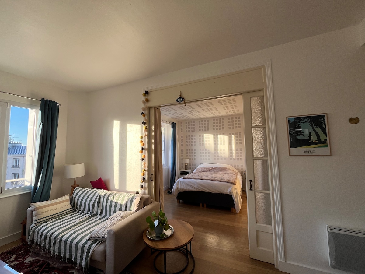 Petite maison de ville à deux pas du joli centre-ville, avec son supermarché, ses bars et ses commerces. La maison est située dans une petite rue à sens unique, très calme, et à côté d’un beau jardin public ainsi que de l‘ancien couvent des Ursulines. La maison est idéalement placée entre terre et mer. Les plages les plus proches sont à 10 min en voiture, la belle campagne avec ses bois entoure la ville. Brest est à 30 min, l‘aéroport à 19 min.