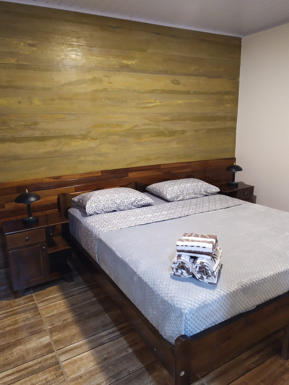 En Costa del Sol Iguazú contamos con 5 amplias cabañas equipadas cómodamente para 4,5 y 6 personas. Las cabañas fueron construidas con maderas autóctonas, respetando el diseño, materiales y tradiciones de la zona y a la vez con toda la tecnología y confort necesario para que tengan una placentera estadía. La cabaña cuenta con 130 metros cuadrados con capacidad hasta 6 personas, en las que se divide en 2 plantas. Con 3 habitaciones y 2 baños.