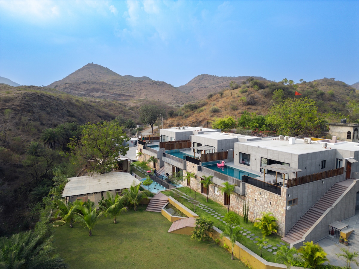 Situated in the embrace of the Aravalli, our 7-BR villa is a micro resort ideal for large group of 20. Spread across 3 independent units, each villa features its own private swimming pool with a gazebo, offering guests the freedom to enjoy privacy. 2 of the 3 units include spacious living areas. Each bedroom comes with attached bathrooms that provide indulgent bathing experience. There are two open-air tubs and 1 enclosed & 2 outdoor showers that bring a resort-like feel to your stay.