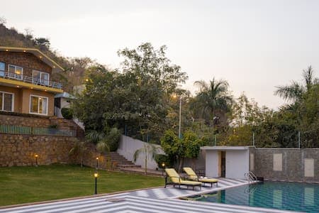 Set high above, this hilltop retreat offers a peaceful escape with access to Badi, Nathdwara, Mount Abu, Fatehsagar, & the heart of the city. This 3-bedroom villa boasts a private pool & a lush garden, where modern interiors meet rustic elegance. Its allure is amplified by a picturesque terrace, a serene outdoor patio, & a private balcony, each showcasing captivating views. Lounge by the pool or in the cosy lounge space this getaway brings together relaxation, bonding, & natural allure.