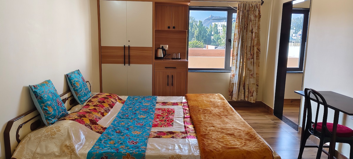 The one room studio apartment is located at second floor with a large veranda and a big roof open area. The windows of room and kitchen directly give a beautiful view of Sajjangarh, the Monsoon Palace. The roof top also gives beautiful view of the City Palace.