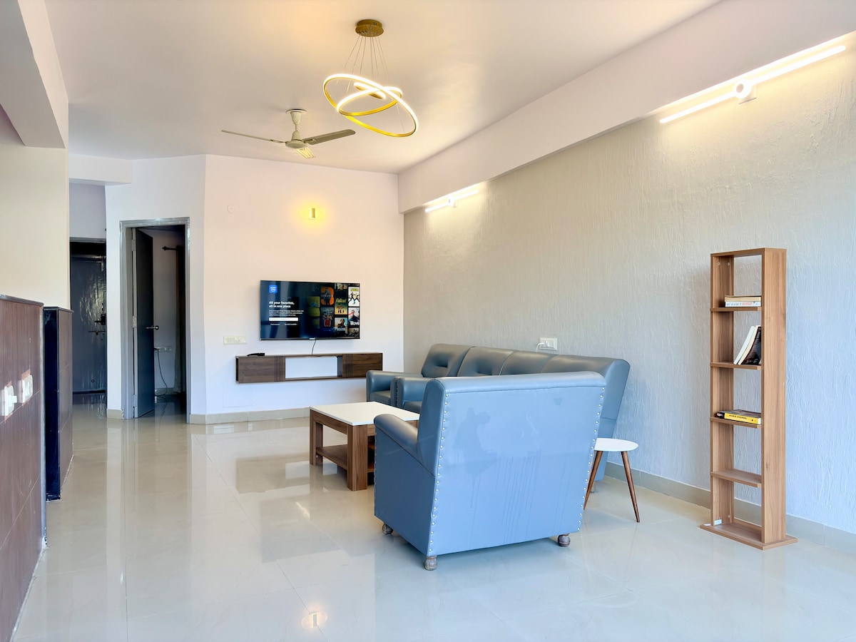 Parties are not allowed at any time; this is a residential society, please be mindful of neighbors and their privacy. Bright 3BR with AC, 2 baths (1 en‑suite) and hot water. Sleeps 6 with 2 queens, 1 double. Large living room with TV. Full kitchen, fridge, RO water. Switchable warm/cool lighting + auto lights. 40 Mbps Wi‑Fi. Balcony seating, designated parking, elevator, power backup. Easy self check‑in (gate code). Interior switch adds extra gate security.