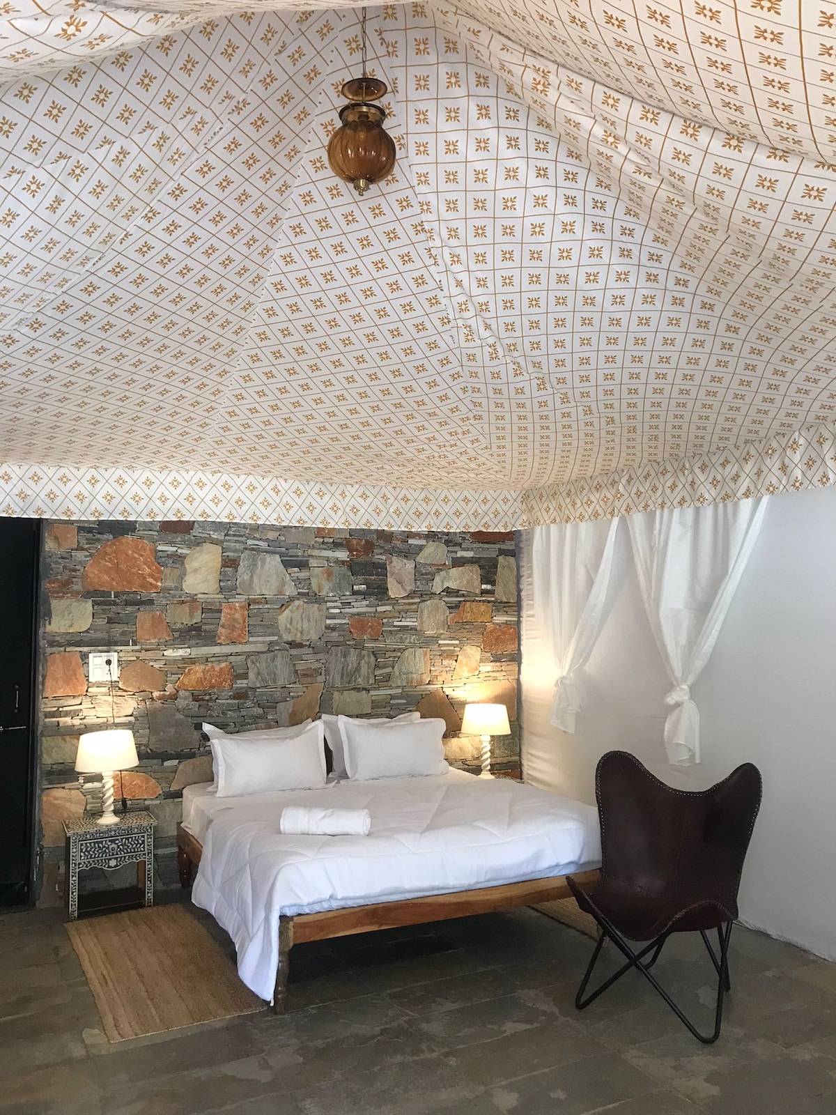 It’s a tent in open terrece total space of 1000 sq feet with attach bathroom and it’s totally private there is seating area in terrece with covered by rooftop dining area is in also terrece for 2 people