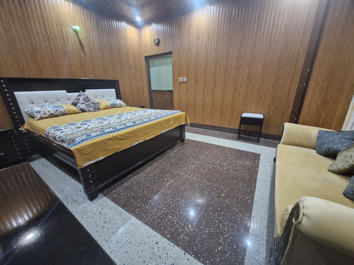 Spacious 1 Kanal luxury home with 6000+ sq. ft. covered area. Features 4 en-suite bedrooms, 2 fully equipped kitchens, large private garden, and cozy TV lounge. Ideal for families or groups seeking comfort and privacy. Housemaid available on request. Peaceful, secure location — perfect for short or long stays. 20 minutes from McDonald, V Mall and other Restaurants.