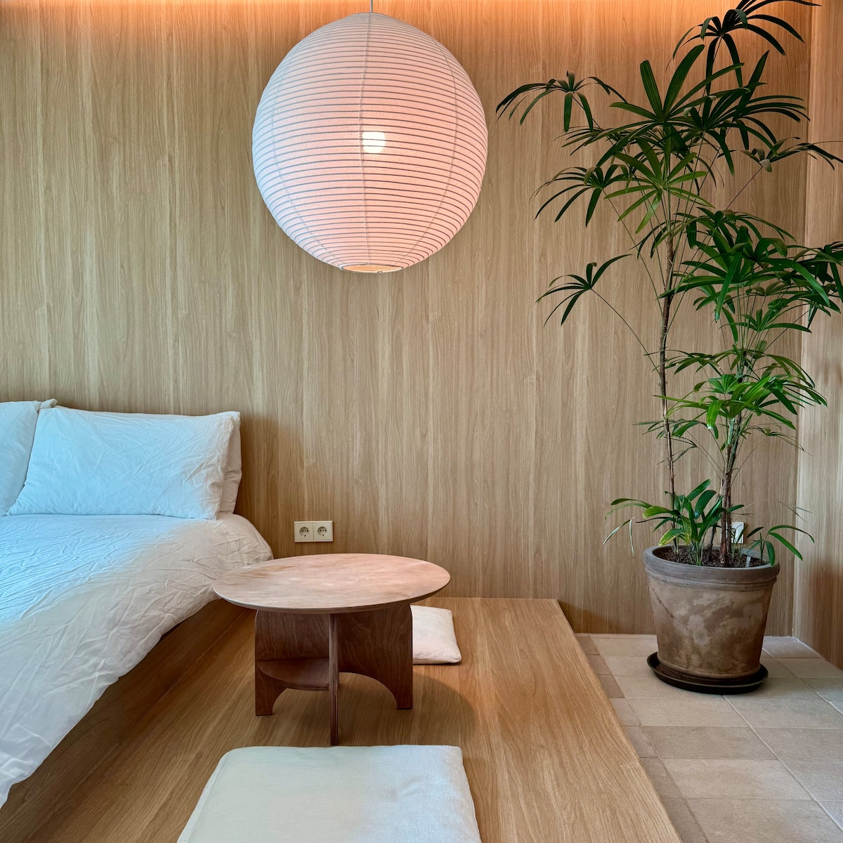 What we had in mind for this room was “deep rest.” Time away from daily life should feel simple and calm, not full of stimulation. We shaped the space with clean lines, soft tones, and the warmth of wood. It’s not flashy, but the details offer quiet comfort. A low table invites you to sit, write, or simply pause. We’ve placed a few short essays and ambient tracks. Meant to be savored slowly. You don’t need to do anything special here. Just stay, and rest well.