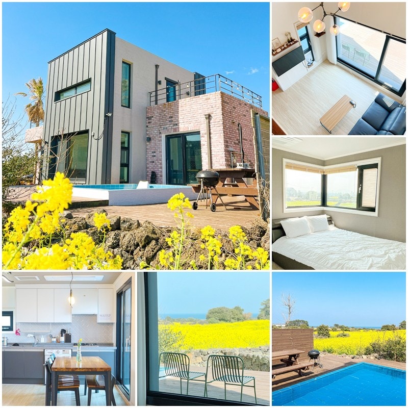 Collaboration of nature and modernity of Jeju. No hidden camera guaranteed. You can try the detector installed in the house. - up to 6 guests - duplex with one livingroom - 2 bedrooms: one with bed, one Korean Ondol - 1 bathroom - front yard - 35 min from the Airport - 3 min from Kimnyung Sea - 5 min from Maze Land - 10 min from HamDuk Sea - 10 min from WolJungRi Sea - 15 min to Pyeongdae-ri - 15 min to Bijarim Forest - 15 min to Sehwa Beach - 25 min to Seongsan Sunrise Peak
