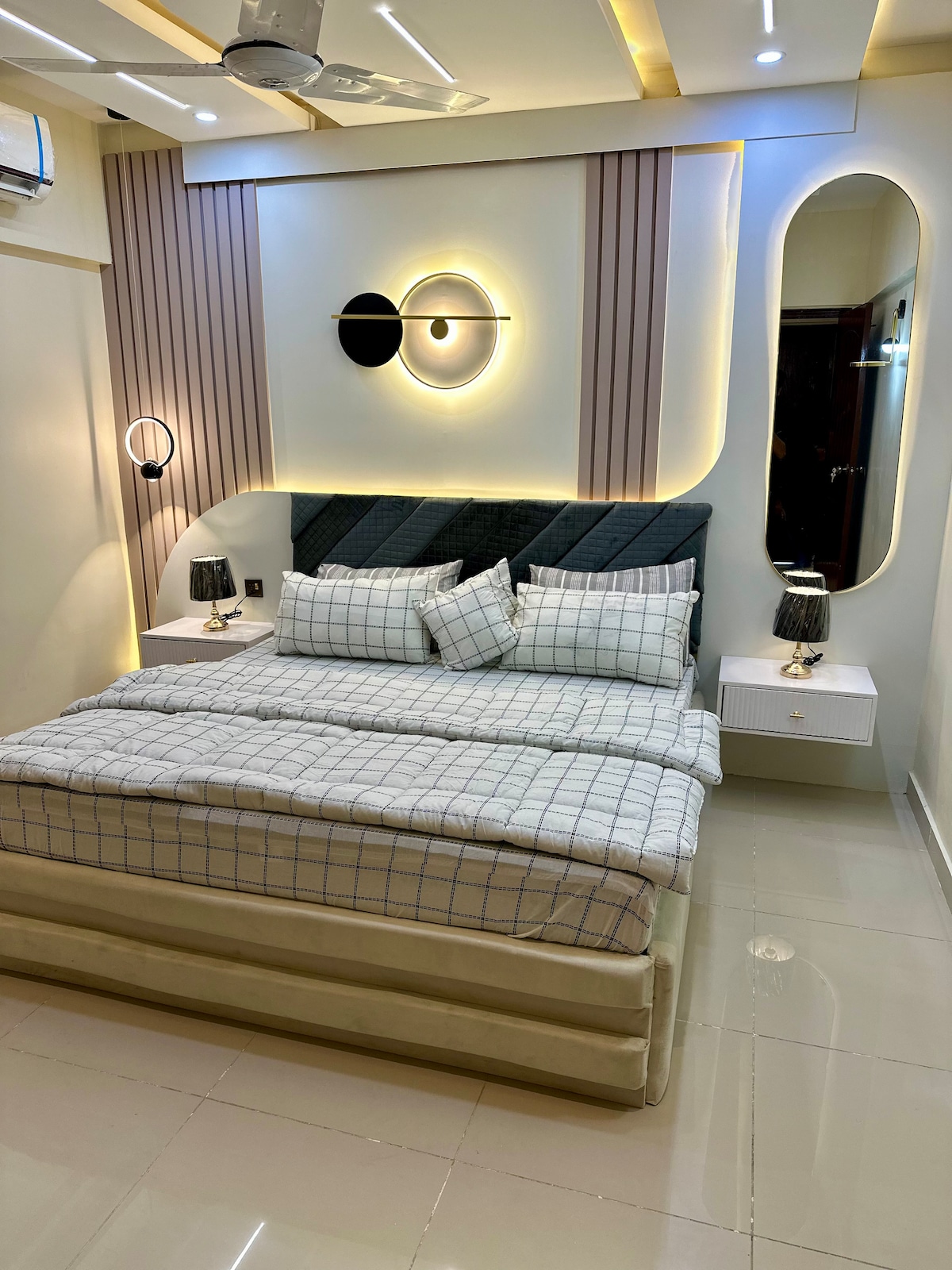 A cozy, fully furnished apartment equipped with all essentials to make you feel at home. Enjoy fresh luxury comforters, soft pillows, and modern amenities for a relaxed stay. Centrally located in Karachi’s most posh and family-friendly area, just 4 minutes from the beach. Surrounded by a variety of restaurants, cafés, shopping malls, and salons. Safe building and neighborhood, perfect for families and long stays.