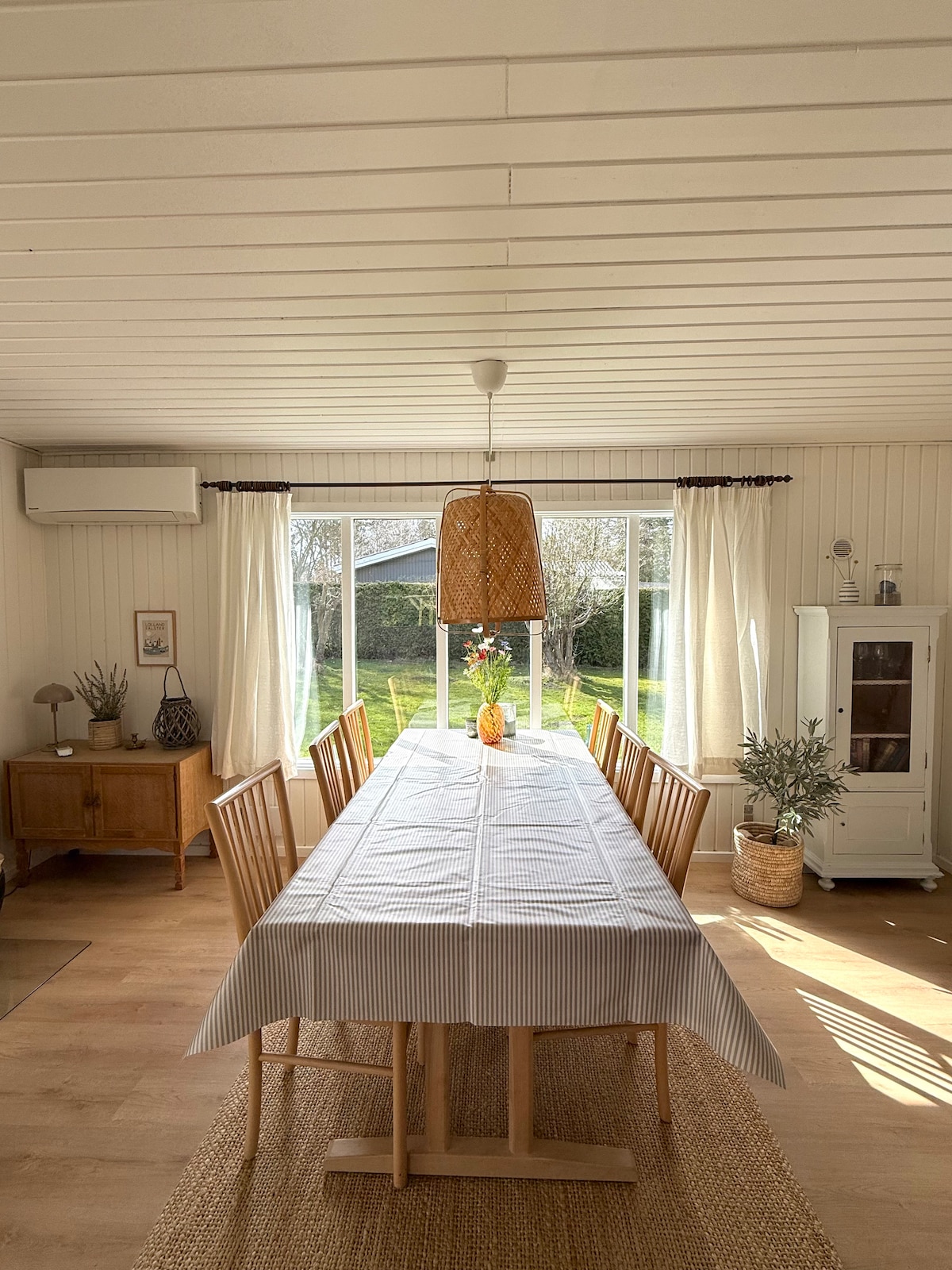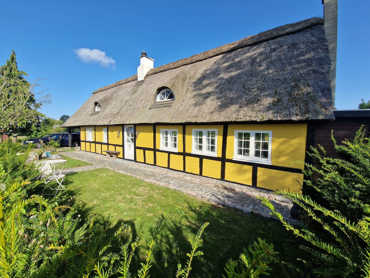 Stor familievenlig feriebolig, halvdelen af stuehuset på en 4-længet gård. Privat have og adgang til stor gårdsplads. Stor naturgrund, skov og sø i gåafstand. Her er ideelt til børnefamilien, vi har badekar, pusleplads, gynge og græs at boltre sig på. Bag grunden ligger byens lille fodboldbane. Der er 5 minuters kørsel til nærmeste sandstrand, og langs kysten utallige perler af de bedste strande i Danmark.
