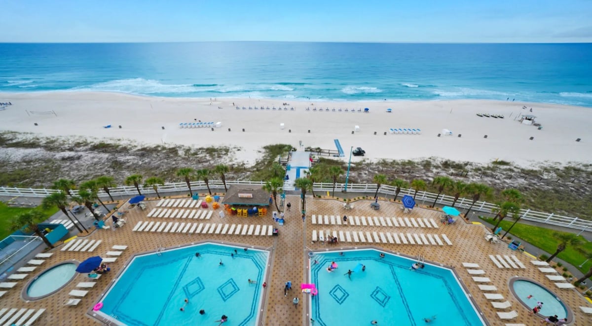 Experience Unparalleled Gulf-Front Luxury on the 15th Floor! This is a 1310 sqft stunning 2 BR, 2 BA+ bunk condo. Sleeps 6 with 1 king bed, 1 queen bed and twin bunk bed. Extra large Balcony. Fully equipped Kitchen and laundry room. The resort-style amenities at Gulf Crest offer gated entrance with covered parking, three high-speed elevators, two outdoor pools, two hot tubs, a kiddie pool, a Tiki Bar, poolside wireless internet, a gazebo, grilling areas, a fitness center, and a game room.